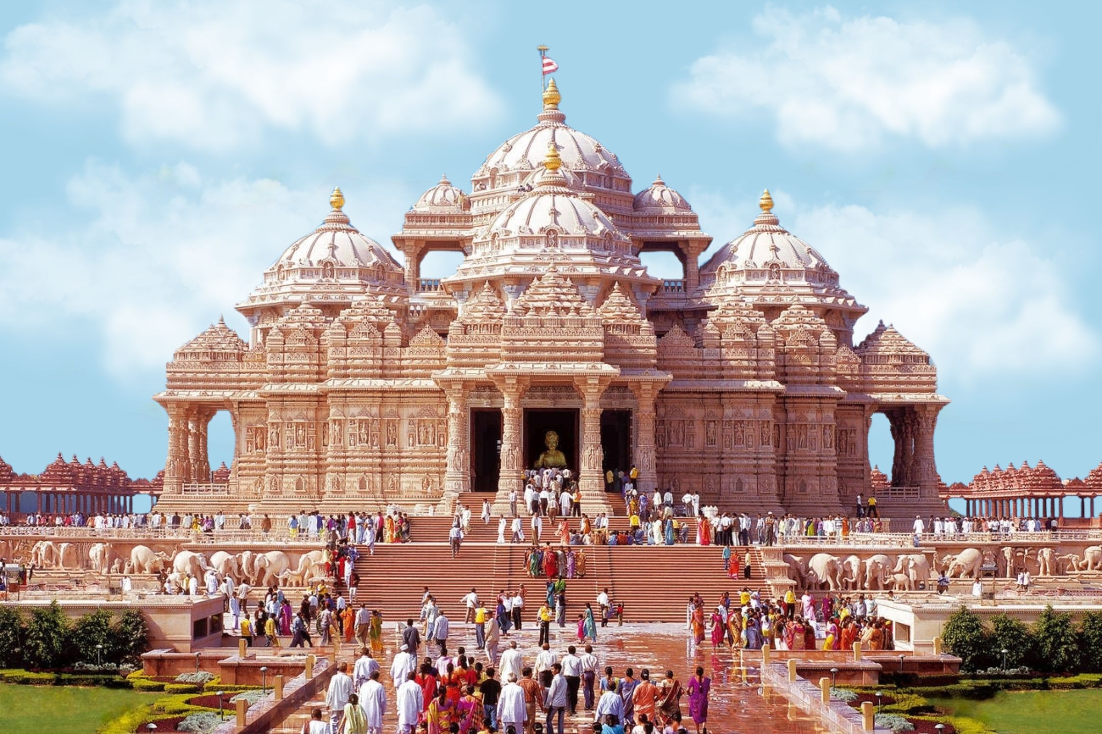India Gate, Qutub Minar, Lotus Temple, Jama Masjid, President’s House, Chandani Chowk, Janpath at Delhi; Taj Mahal, , Red Fort, Sikandra, Itmad-ud-daula, Fatehpur Sikri, at Agra; Hawa Mahal.